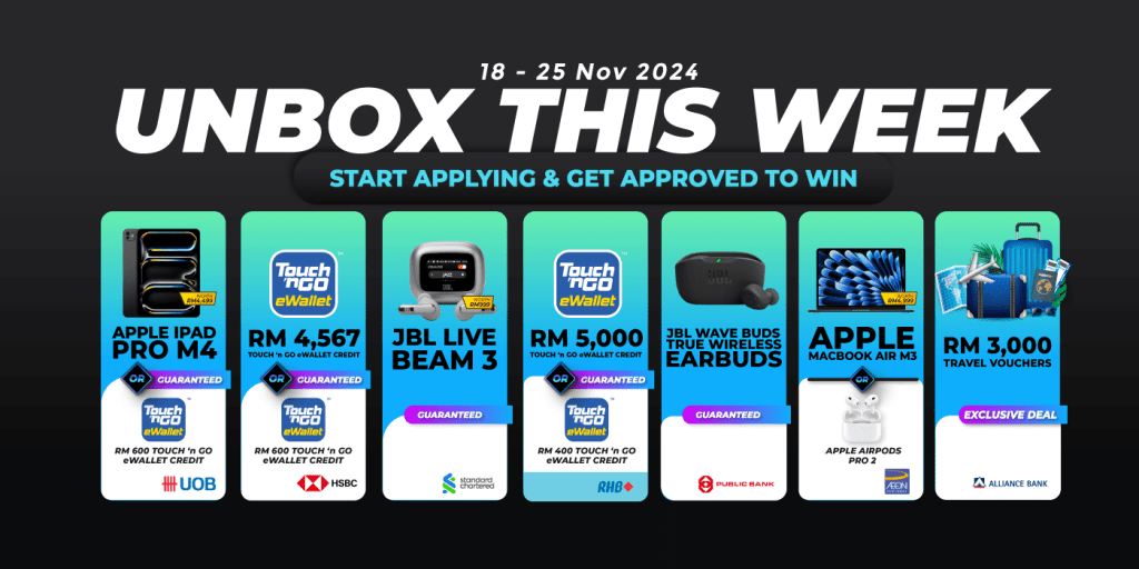 Unbox this week is back again with great prizes just for you! Walk away with the Apple iPad Pro M4, JBL Live Beam 3 guaranteed, or even RM3,000 Travel Vouchers and more when you apply for a credit card via RinggitPlus.