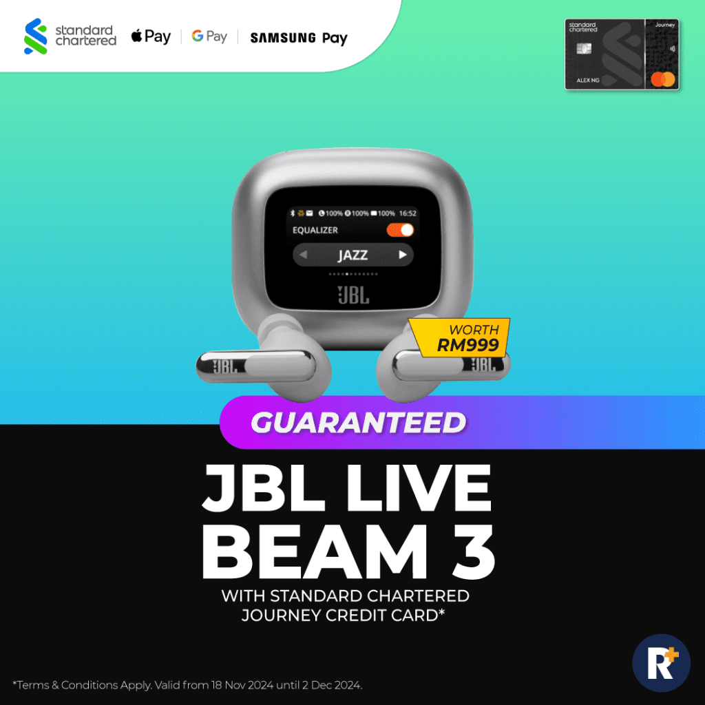 Apply for a Standard Chartered Credit Card this week and receive a pair of JBL Live Beam 3 earbuds worth RM999, guaranteed!