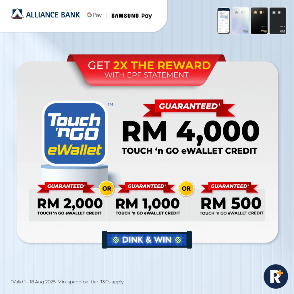 This week, apply for an Alliance Bank Credit Card and you are guaranteed to walk away with RM4,000, RM2,000, RM1,000, or RM500 in Touch ‘n Go eWallet Credits!