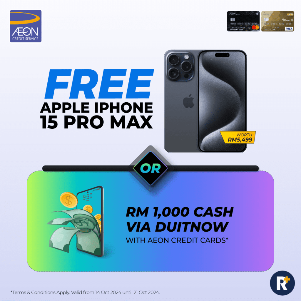 The iPhone 15 Pro Max could be yours when you apply for an AEON Platinum card. Didn’t win? You’ll still be getting guaranteed RM300 cash via DuitNow!