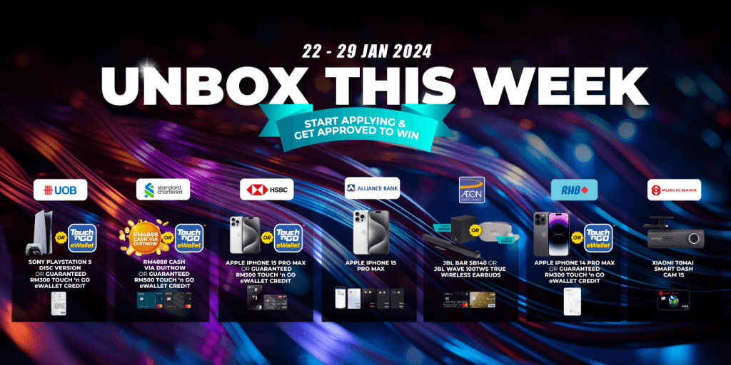 Looking to win amazing prizes before the Chinese New Year? Then look no further, as the RM4,888 Cash Via DuitNow, iPhone 15 Pro Max, the PlayStation 5, and more could be yours when you apply for a credit card with Unbox This Week!