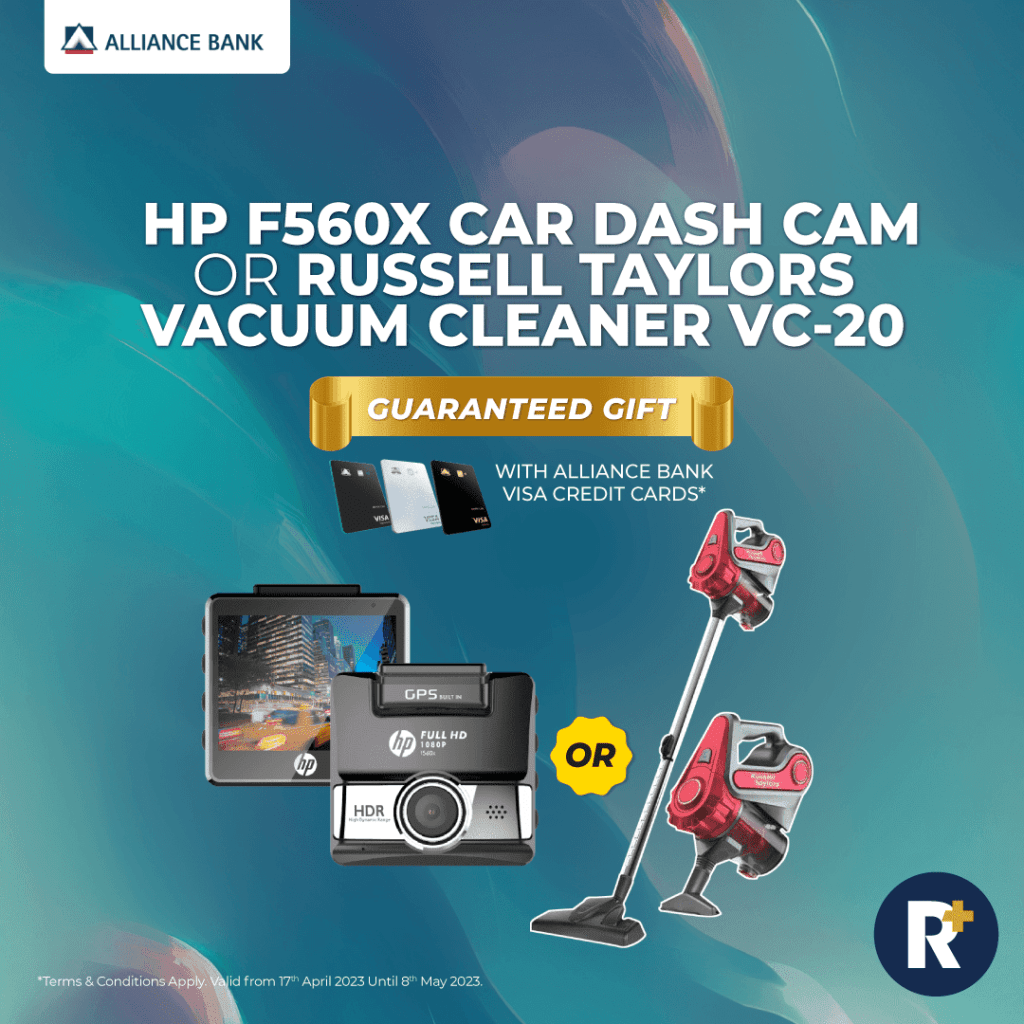 Take home a guaranteed HP f560x Car Dash Cam or Russell Taylors VC-20 Vacuum when you apply for a new Alliance Bank Credit Card.
