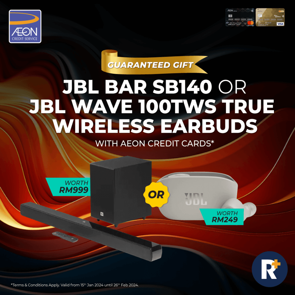 The JBL Bar SB140 soundbar is guaranteed to be yours when you apply for an AEON Platinum Card, or you could win it when you apply for an AEON Gold Card.