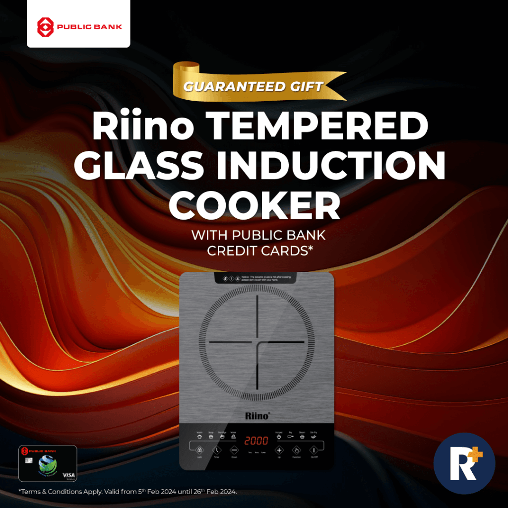 Apply for a Public Bank Credit Card and receive a guaranteed Riino Tempered Glass Induction Cooker featuring an ultra-slim design and a tempered glass cooktop, ensuring effortless cleaning after each use.