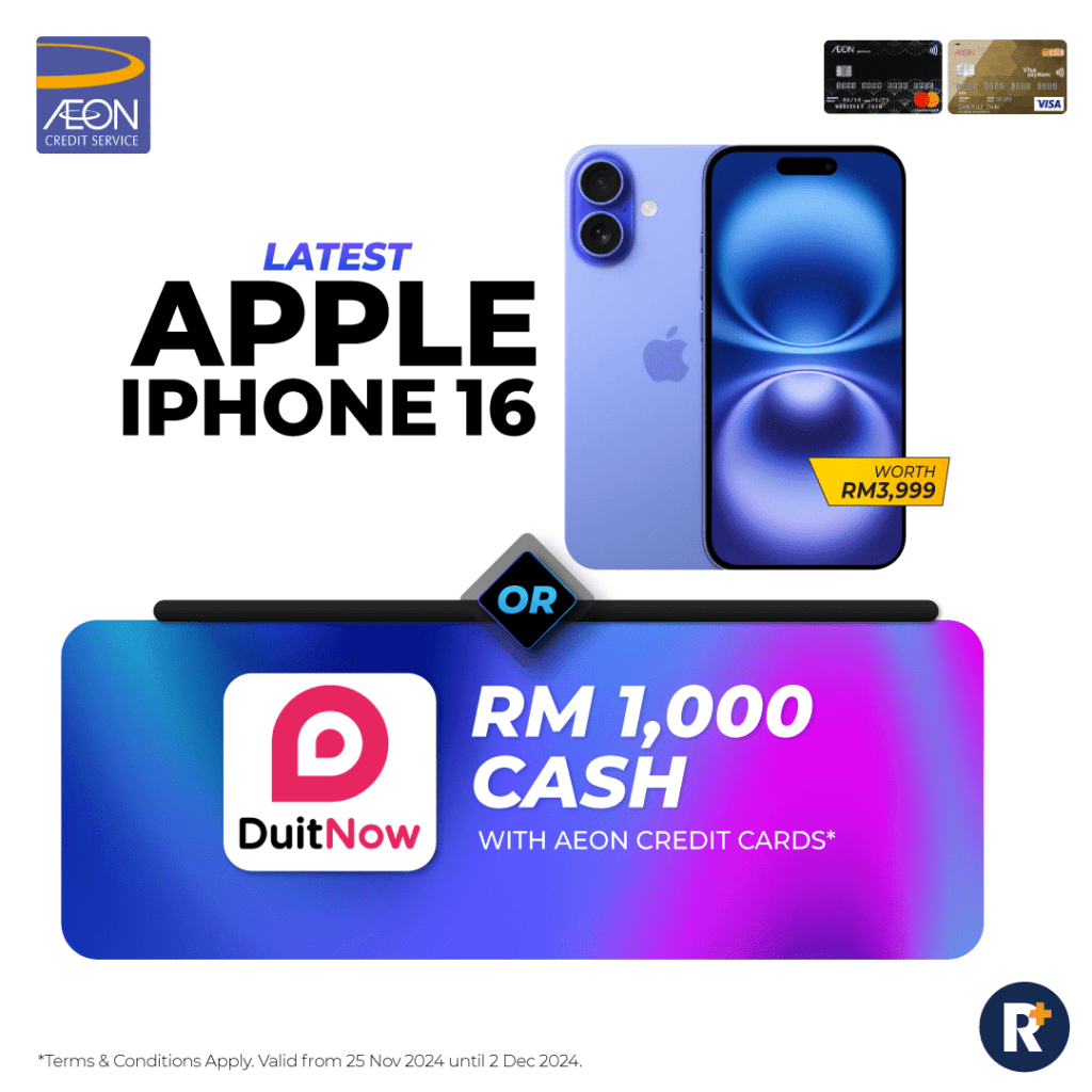 The iPhone 16 could be yours when you apply for an AEON Platinum card. Didn’t win? You’ll still be getting guaranteed RM300 cash via DuitNow!