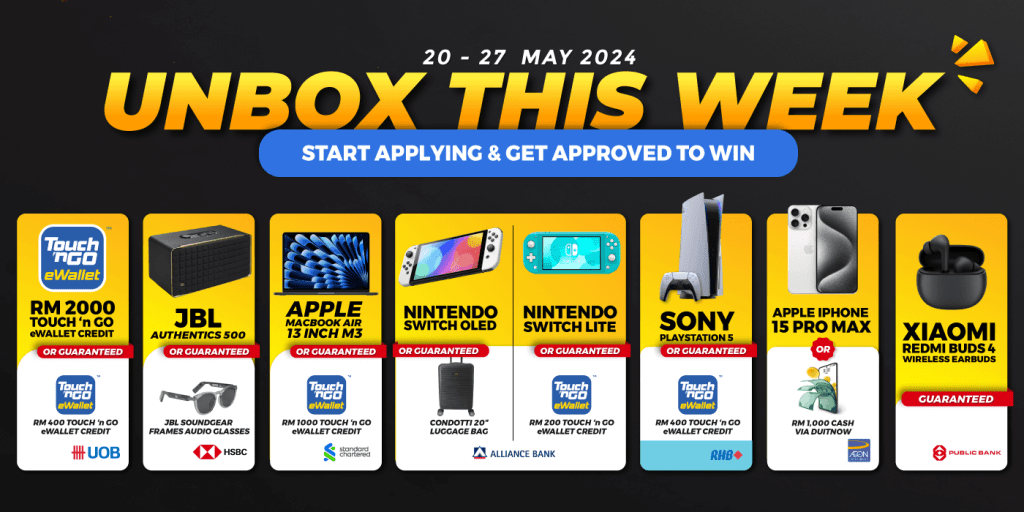Are you looking to get a new credit card? Apply through RinggitPlus and gain a chance to win incredible prizes, such as RM5,000 Cash, PlayStation 5, MacBook Air M3, iPhone 15 Pro Max, and more with our Unbox This Week!