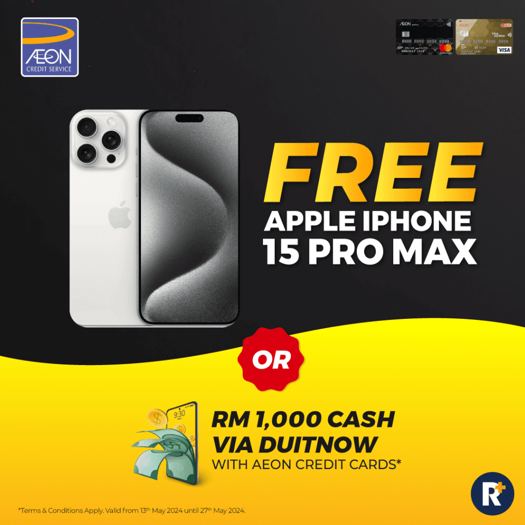 Apply for an AEON Platinum Credit Card and you could take home the iPhone 15 Pro Max, equipped with the potent A17 Pro chip, ideal for professional and leisure activities alike. This model features a convenient USB-C charging port and is cased in aerospace-grade titanium for exceptional durability.