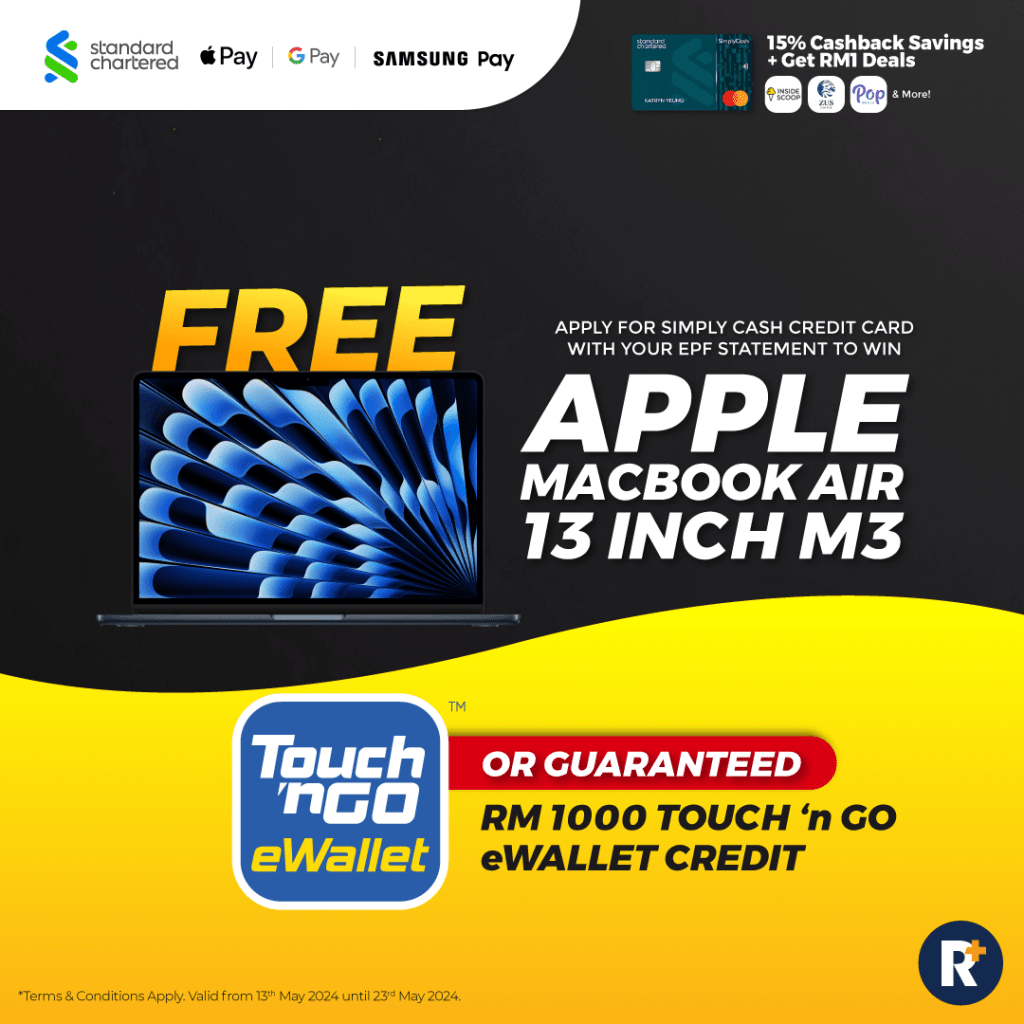 Apply for a Standard Chartered credit card this week and you could win a MacBook Air M3, featuring the new M3 chip and offering up to 19 hours of battery life. Its lightweight aluminium body combines durability with portability, making it the perfect tool for today’s professionals.