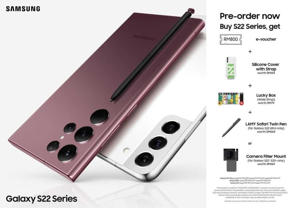 Galaxy S22 Ultra pre-order gifts: RM800 eVoucher, Silicone Cover with Strap, Galaxy x LAMY Safari Twin Pen, Lucky Box (1x wide strap for Silicone Cover with Strap)