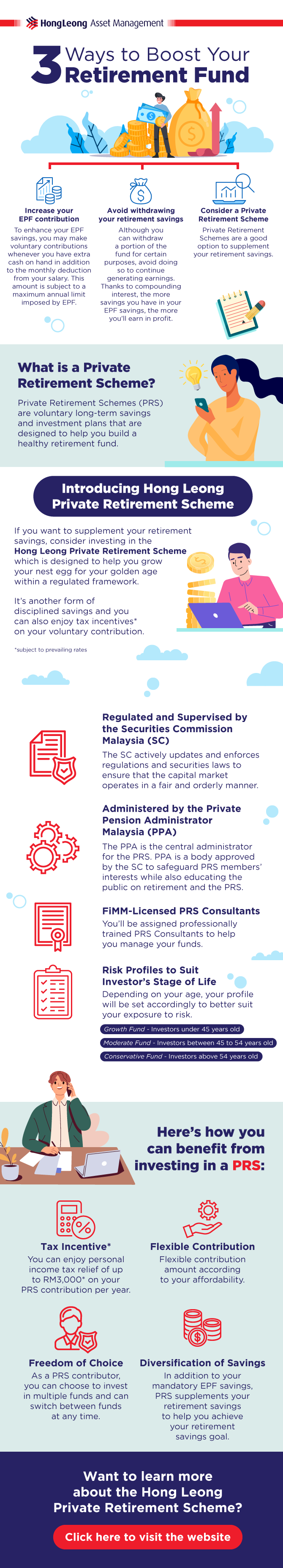 If you want to learn more about how you can encourage better growth for your retirement fund, continue reading Hong Leong Asset Management Bhd’s Infographic on 3 Ways to Boost Your Retirement Fund.