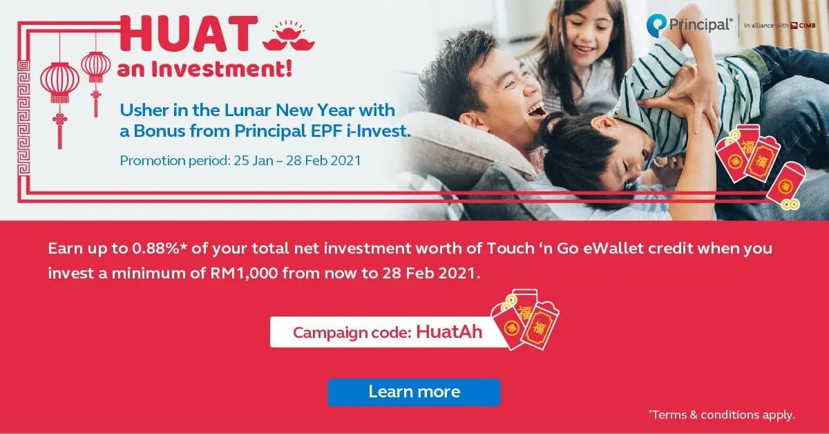 Principal EPF i-Invest is offering its seasonal Huat Ah! promotion from 25 January to 28 February 2021 for new and existing Principal EPF i-Invest investors, where you can earn up to 0.88%* reward of your total investment with Principal EPF i-Invest with a minimum investment of RM1,000 by inserting the campaign code “HuatAh” via EPF i-Invest!