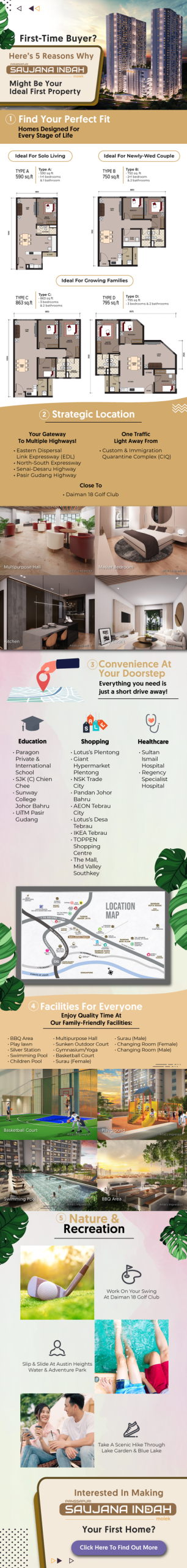 With its accessibility to CIQ and major highways, family-friendly facilities, and serene natural surroundings, Pangsapuri Saujana Indah is an ideal first property, especially for those commuting across the causeway on a daily basis. Interested? Find out more about Pangsapuri Saujana Indah here.