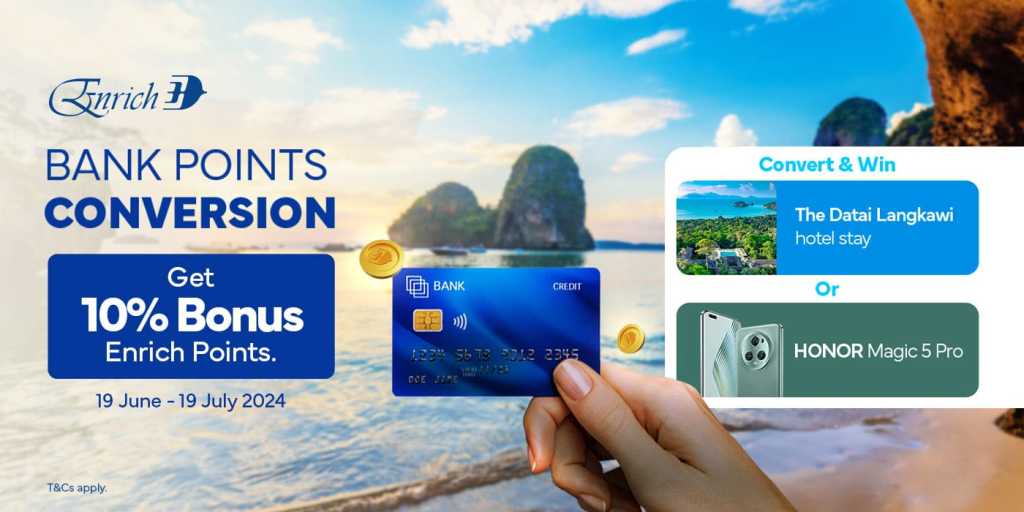 This campaign, organised by Enrich in partnership with participating banks, lets you earn 10% Bonus Enrich Points when you convert your bank points to Enrich Points from 19 June – 19 July 2024.