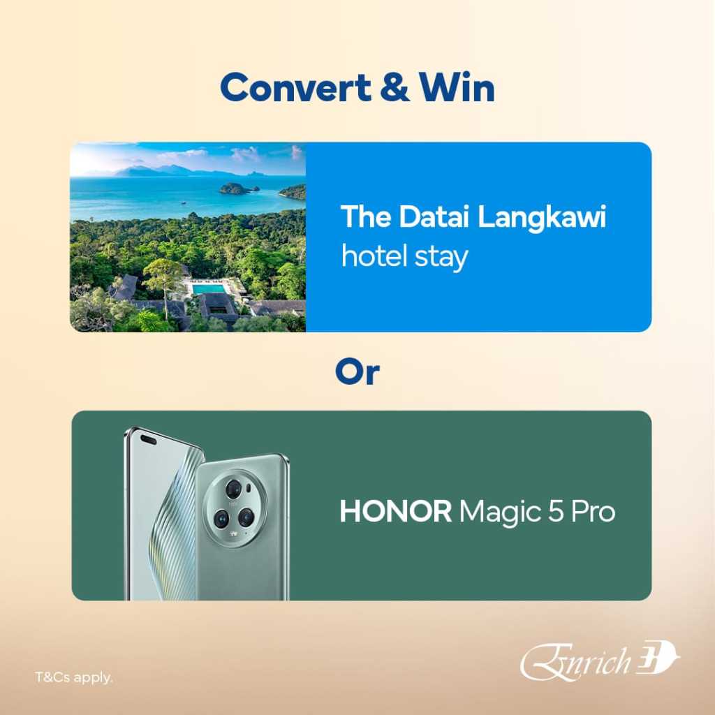 On top of getting more value from your bank rewards points, you’ll also be in the running to win a luxurious stay at The Datai Langkawi hotel or the latest Honor Magic 5 Pro smartphone! Simply convert your bank rewards points to Enrich Points during the promotion period.