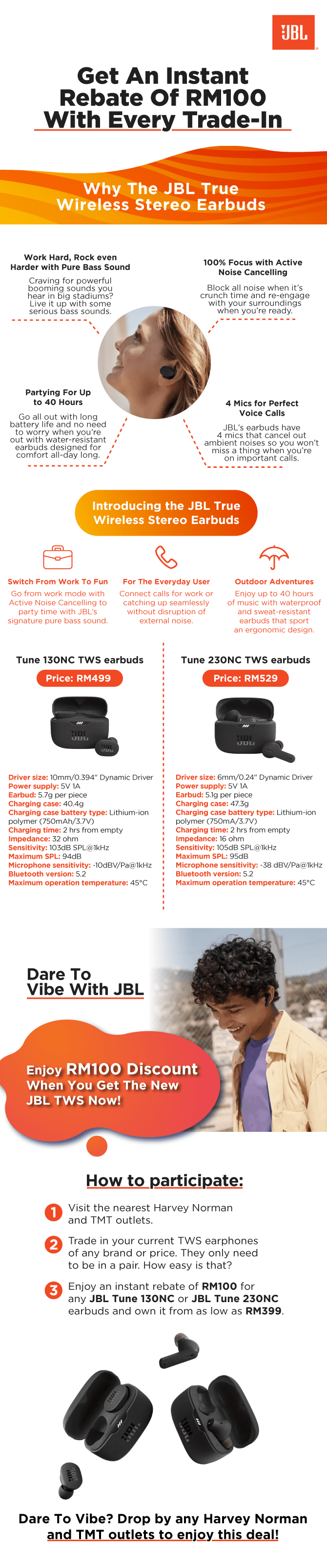 JBL, a household name popular for its expertise in creating audio technologies, has recently launched two True Wireless Stereo (TWS) earbuds – the JBL Tune 130NC and JBL Tune 230NC, and you can enjoy a rebate of RM100 with your purchase!