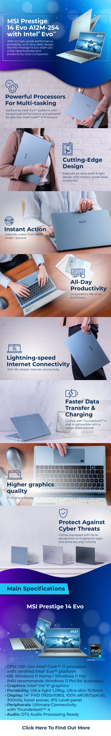 Enter the MSI Prestige 14 Evo A12M-254, a work laptop designed to seamlessly integrate into the dynamic lives of today’s professionals. Tailored for the modern workforce, the MSI Prestige 14 Evo A12M-254 with Intel® EvoTM provides the best overall laptop experience without compromising power, boasting a blend of cutting-edge features and sleek design.