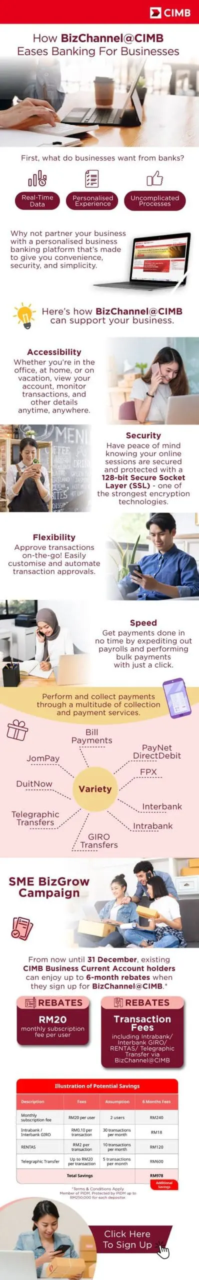 For those who have yet to sign up for a CIMB Business Account-i, sign up here to open an account online at your convenience! The CIMB Business Account-i automatically comes with access to BizChannel@CIMB so you can perform business banking with convenience and security. For more information, head to CIMB’s website.