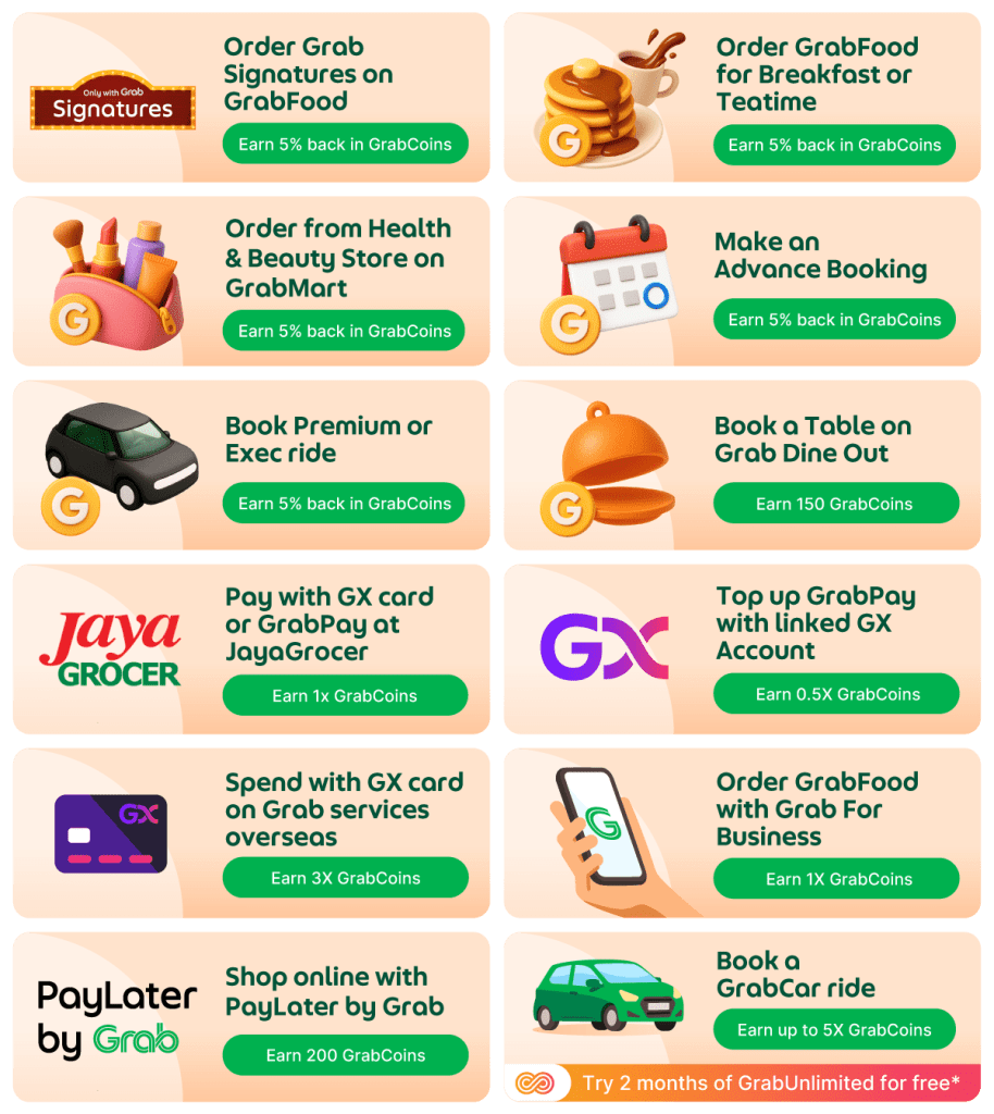 GrabUnlimited members can earn up to 5X GrabCoins on eligible transactions. This multiplier applies to most earning activities above, turning your 5% cashback into 25% on qualifying orders. The membership starts from as low as RM3.99 monthly.