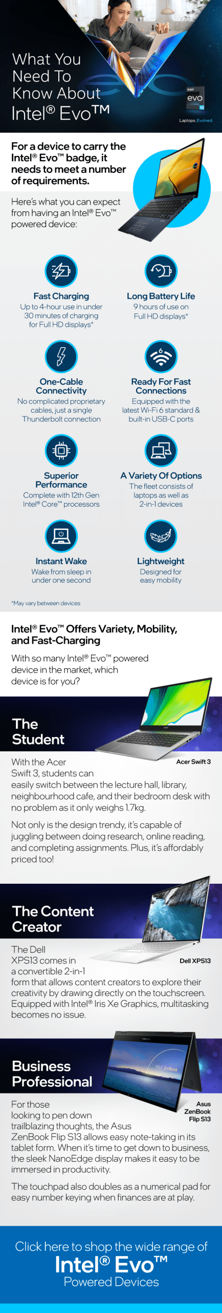 There are clearly many benefits of owning an Intel® Evo™ powered device. They’re lightweight, which makes it easy for users to work from anywhere. The long battery life means it doesn’t need to be connected to the charger for most of the day. In fact, they’re even equipped with fast charging. On top of that, users don’t need to wait for the laptop to load for a long time after it sleeps because the devices are required to instantly wake in under a second.