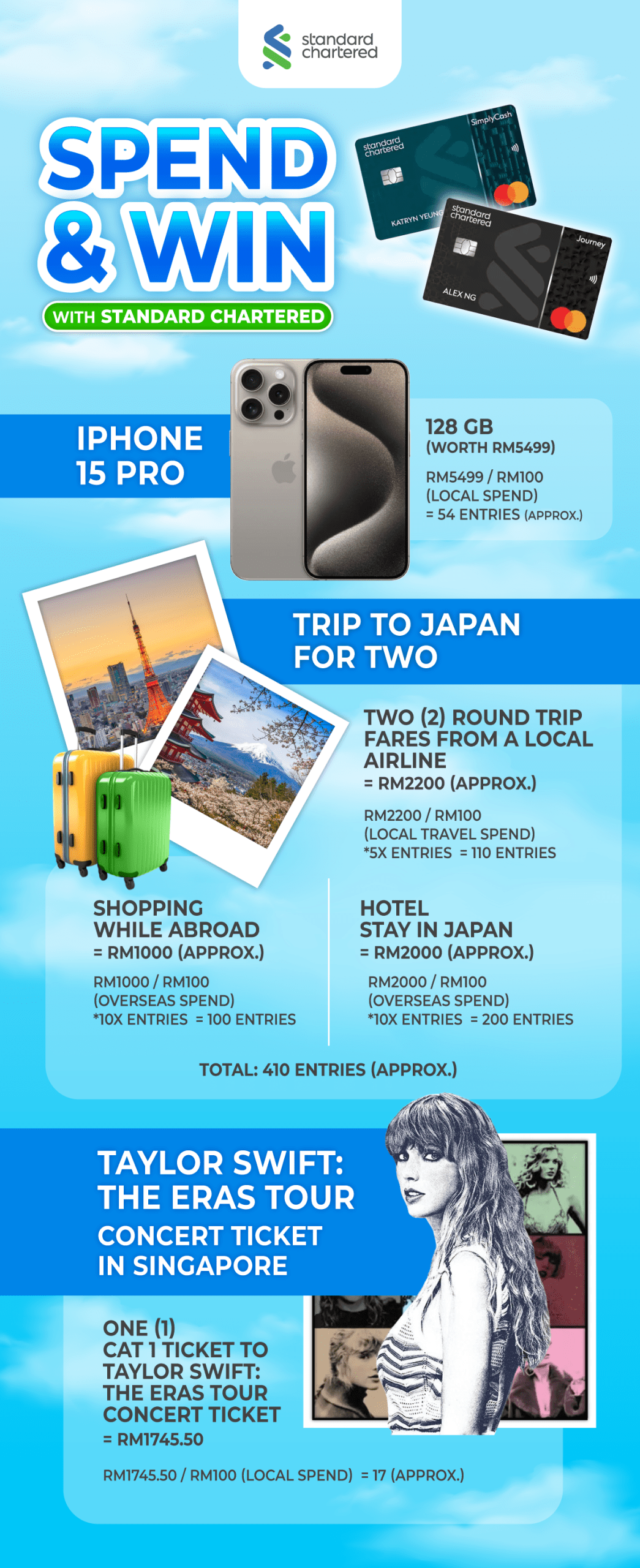 Whether you’ll be Christmas shopping or travelling during the year-end, there are plenty of opportunities for you to earn entries for the Standard Chartered Spend & Win campaign. All you need to do is to spend with your Standard Chartered credit card.