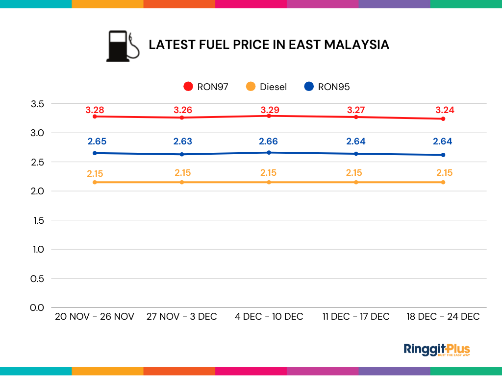| December 18, 2025- December 24, 2025 | BUDI95: RM1.99 (RM0) RETAIL: RM2.62 (-RM0.02) | RM3.24 (-RM0.03) | PM: RM3.02 (-RM0.04) EM: RM2.15 (RM0) |