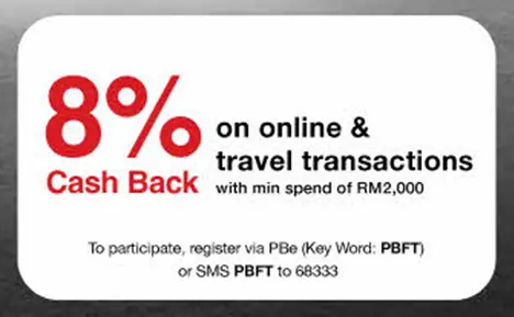 | 8% cashback on online and travel transactions | Minimum cumulative spend of RM2,000 per month | – Capped at RM50 cashback per month per cardholder – Total monthly allocation of RM80,000 provided by Public Bank for this sub-campaign |
