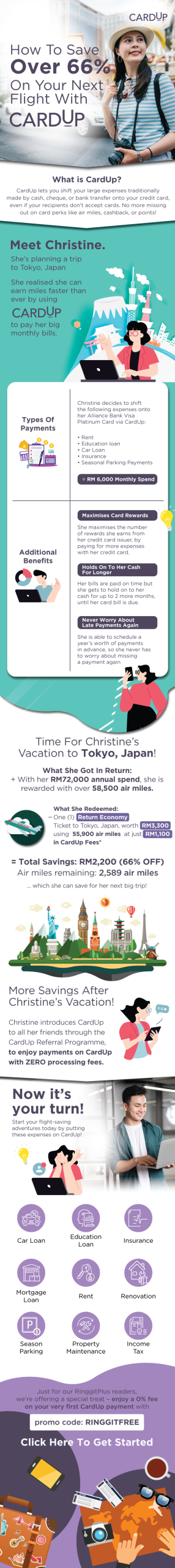 Plus, as a special offer for all RinggitPlus readers, you can try CardUp for FREE! Shift any bills onto your preferred credit card on CardUp and enjoy a 0% fee on the first RM4,000 payment. Use promo code RINGGITFREE at checkout to enjoy this promotion. Terms & Conditions Apply. For further savings, you can see all other ongoing promotions here.