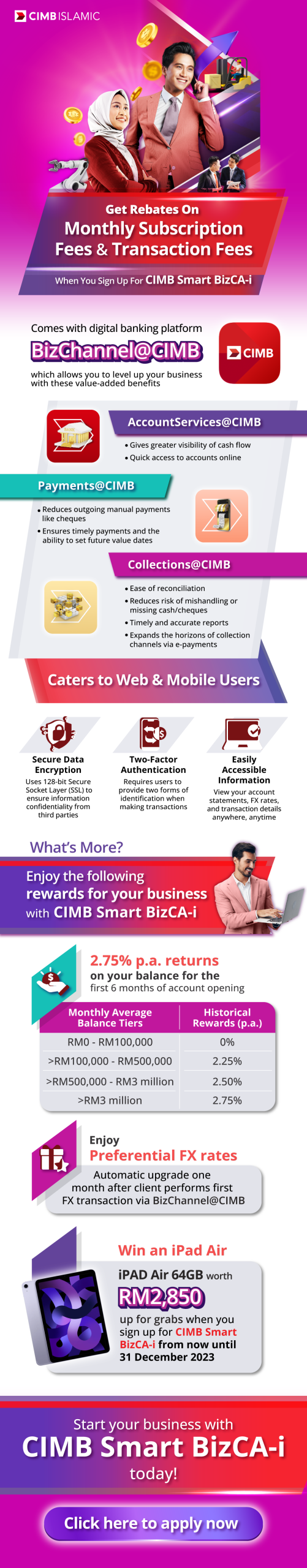 CIMB Smart BizCA-i offers effortless financial transactions, monitors cash flow, and supports financial planning, all while providing the advantage of fee rebates, preferential FX rates, and rewarding rates linked to Historical Hibah rates. Moreover, as a business proprietor, you’ll have access to a range of digital solutions via BizChannel@CIMB for your benefit.
