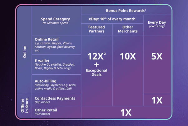 The highlight of the CIMB e Credit Card, however, lies on the 10th of every month which is also called the eDay. On eDay, instead of 5x BP, you will get 12x BP plus exceptional deals with Featured Partners and 10x BP with other merchants when spending on online shopping, auto-billing expenditure, and e-wallet reloads. Contactless payment via tap will also grant users 12x BP and 10x BP for Featured Partners and other merchants respectively, with the PIN method remaining at 1xBP.