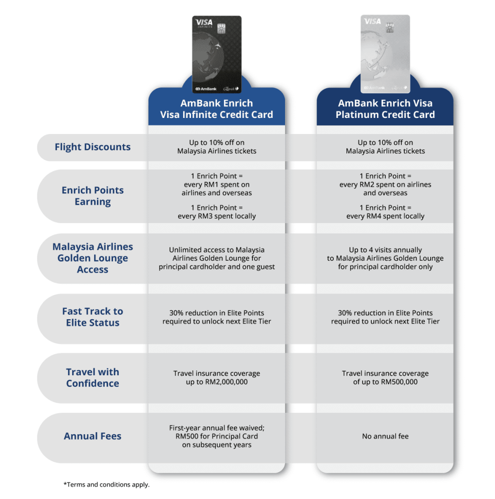 Both the AmBank Enrich Visa Infinite Credit Card and the AmBank Enrich Visa Platinum Credit Card offer up to 10% off Malaysia Airlines tickets, providing instant savings to all your travel plans.