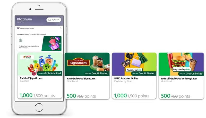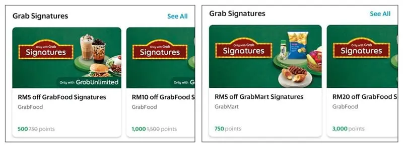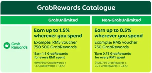 | Redemption rate | 800 GrabRewards for RM5 voucher | 500 GrabRewards for RM5 voucher | 750 GrabRewards for RM5 voucher |