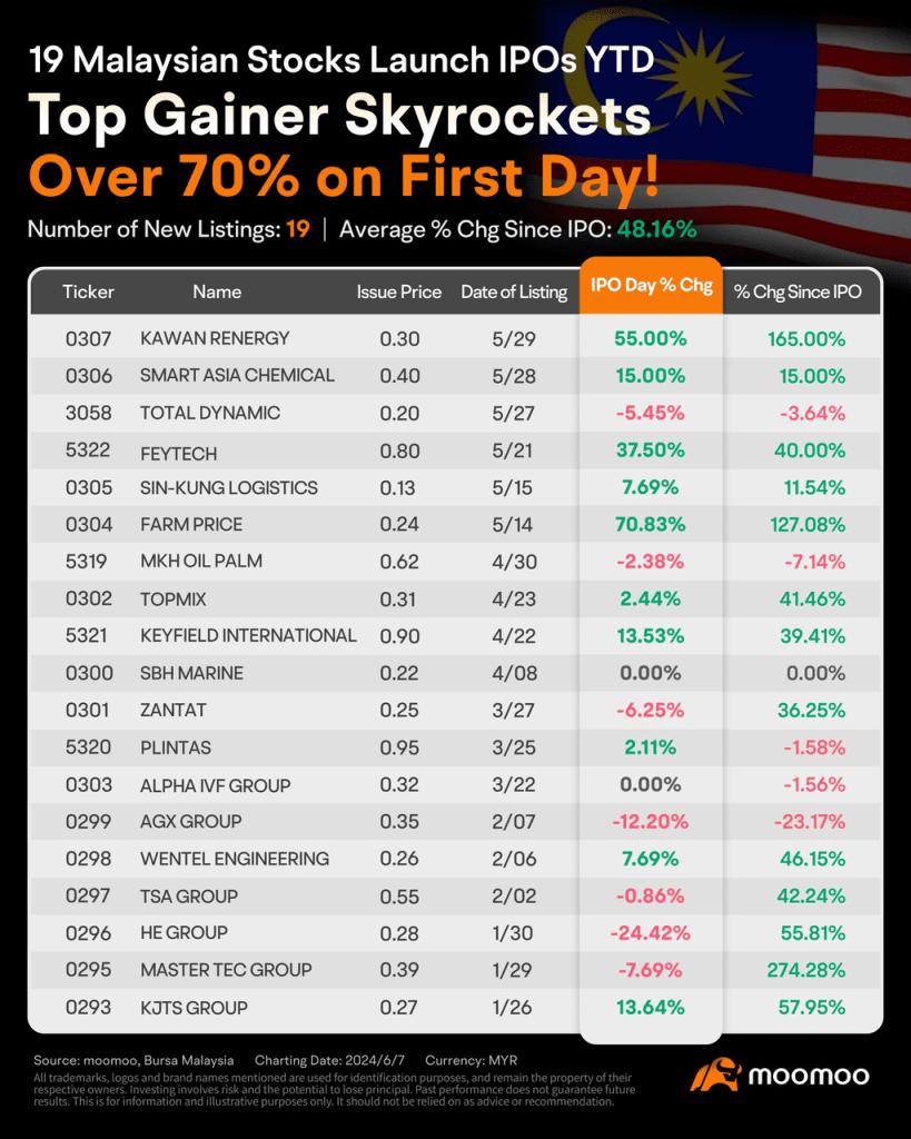 As of 2024, the Malaysian IPO scene has been very active, with some analysts calling it an “IPO Gold Rush”. So far, 19 companies have listed, spanning the healthcare, agriculture, and technology sectors. These companies have seen an average initial gain of 8.75% on their IPO day, with nearly 70% rising on their debut. Six companies reported gains exceeding 10%, with two companies—Kawan Renergy and Farm Price—achieving particularly strong single-day surges of 55.00% and 70.83%, respectively.
