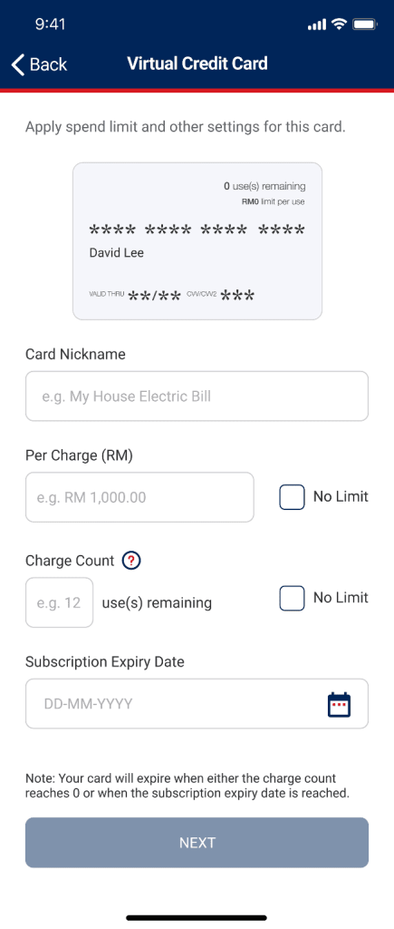 Besides one-time payments, you also can set up additional virtual cards for things that require recurring payment, for example, bills and personal subscriptions. For each card number you generate, you can set specific parameters, including a Spend Limit and expiry dates either based on the maximum number of transactions, maximum amount per transaction or a specific expiry date. This way, even if your card information is compromised, these additional features minimise the risk of losses.