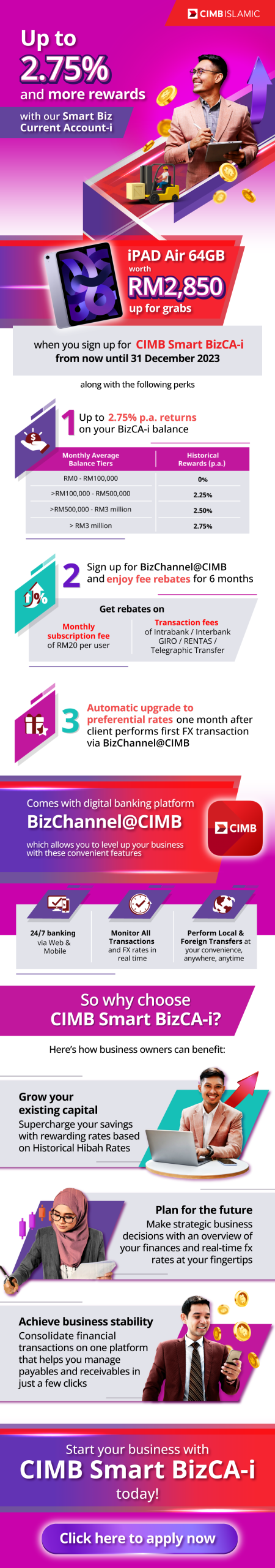 Amidst these trials, it becomes essential for business owners to find solutions that not only alleviate their burdens but also offer tangible rewards. Introducing CIMB Smart BizCA-i – a comprehensive current account that not only eases the day-to-day financial aspects of business operations but also further provides busy business owners with rewarding rates, fee rebates, and more.