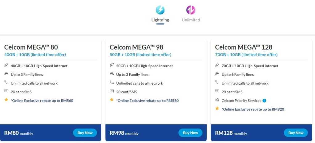 | Celcom MEGA 98 | RM98/month | – 50GB high-speed internet – Up to 3 Family Lines – Unlimited calls to all networks – 20 sen/SMS | – 60GB high-speed internet – Up to 3 Family Lines – Unlimited calls to all networks – 20 sen/SMS |