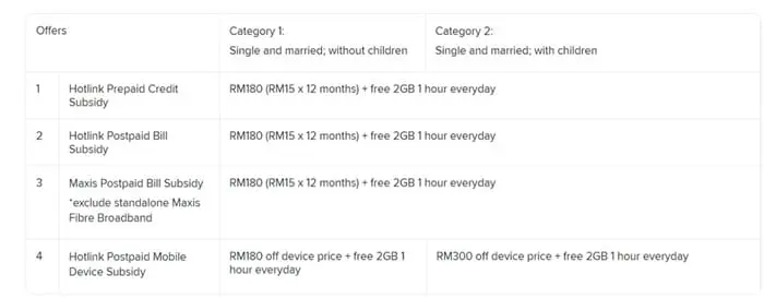 Meanwhile, postpaid customers can choose between the credit subsidy or device subsidy. Eligible households with children will be allowed to redeem either a rebate of RM300 for the purchase of a new phone or a monthly rebate of RM25 over 12 months with a new phone included. As for individuals without children, they will get a rebate of RM180 to purchase a new phone, or a monthly rebate of RM15 over 12 months – but without a new phone included.
