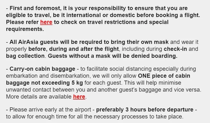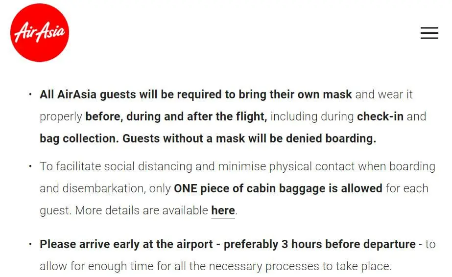 Following these events, AirAsia’s updated version of its statement on Covid-19 safety measures no longer mentions the revised 5kg cabin baggage allowance. Its official cabin baggage policy now states that the allowed cabin baggage weight is 7kg per person. However, passengers are still limited to only one piece of carry-on luggage, which is subject to the new size restrictions.