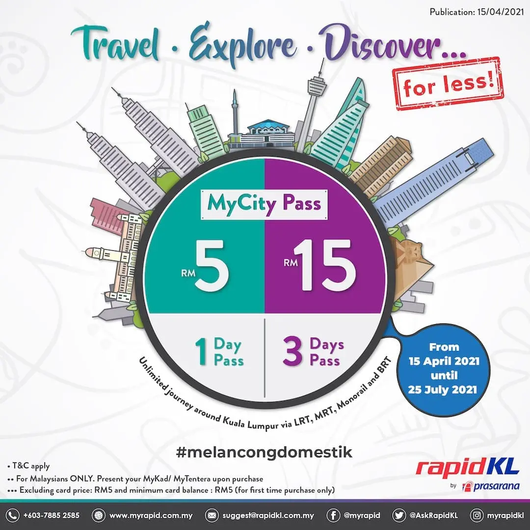 Prasarana Malaysia is reintroducing discounts on its MyCity Passes from now until 25 July 2021. With the discounts taken into consideration, the 1-day MyCity Pass now costs RM5 while the 3-day pass is priced at RM15.