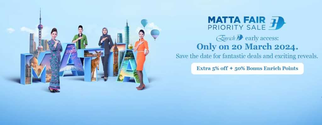 Malaysia Airlines (MAS) is offering Enrich members an exclusive one-day early access to its sale for the upcoming MATTA Fair, before the event is officially made open to the public from 21 to 30 March 2024. This means that as an Enrich member, you’re already able to access and tap into the various deals and perks offered by MAS via its MATTA Fair Priority Sale starting from today (20 March 2024).
