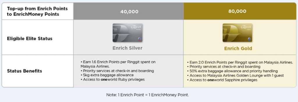 Finally, Enrich clarified that if the Elite status that you’re entitled to via this top-up campaign is the same as your current Elite tier, then your status will remain unchanged and there will be no upgrade to the next higher status. So for instance, if you are currently already an Enrich member with a Silver Elite status, then you will not be upgraded to the next level (Gold) by converting another 40,000 Enrich Points to top up your EnrichMoney Points. Instead, you will only be able to extend and retain your Silver status (for one year).