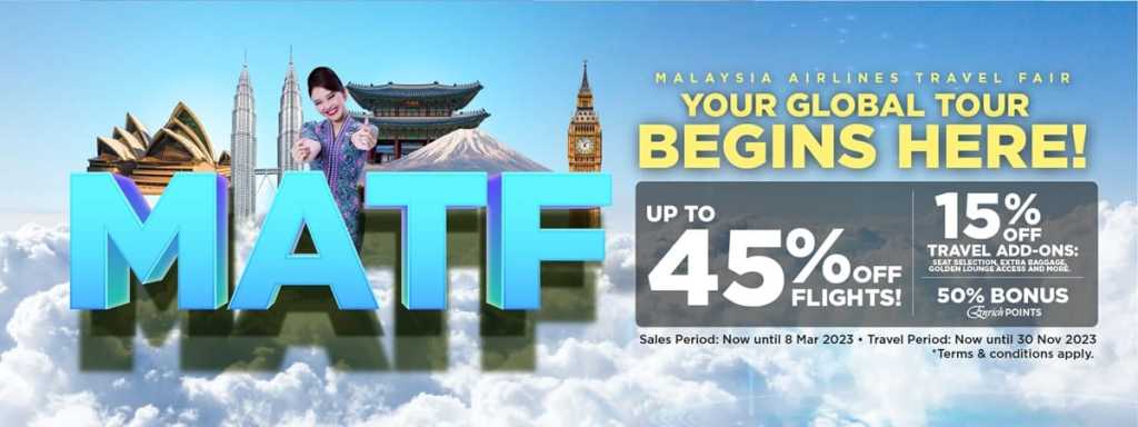 Malaysia Airlines (MAS) is back with its popular Malaysia Airlines Travel Fair (MATF), this time offering up to 45% discount for flights to selected domestic and overseas destinations. With tickets starting from as low as RM99 (all-in, one-way), travellers can also tap into additional perks, namely 15% off for add-ons and 50% bonus Enrich Points for every ticket purchase.