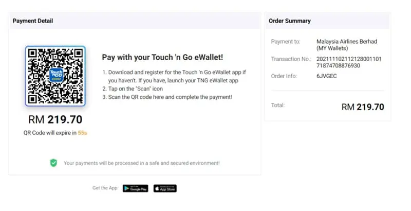 Once you’ve selected your flights and keyed in the required details, you’ll then have to pay by scanning the TNG eWallet QR code that is generated at the payment page.