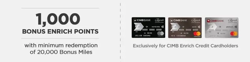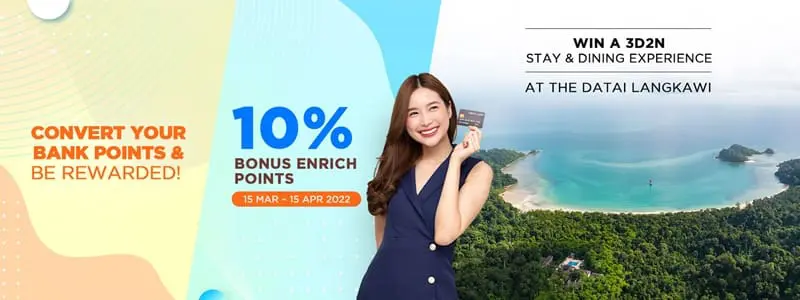 Each bank will – of course – have its own conversion rate, with a minimum points conversion requirement, which you can check out here. Enrich members are also allowed to make as many conversions as they like, as long as they have enough credit card points to do so. CIMB, in particular, also has a special offer that lets selected cardholders earn an additional 1,000 Enrich Points – on top of the 10% bonus Points – if they make a minimum redemption of 20,000 Points, although this is limited only to the first 200 cardholders.