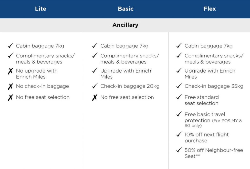To recap, these flexible fare options are meant to allow greater personalisation for MAS passengers with varying levels of preference on the benefits required on a flight. The Lite fare, which only offers the essentials like 7kg of cabin baggage, is targeted towards day-trippers and business commuters; the Basic fare, with Enrich Mile upgrade options, 20kg check-in baggage, and 1x rebooking fee waiver offers a more classic full-service experience.