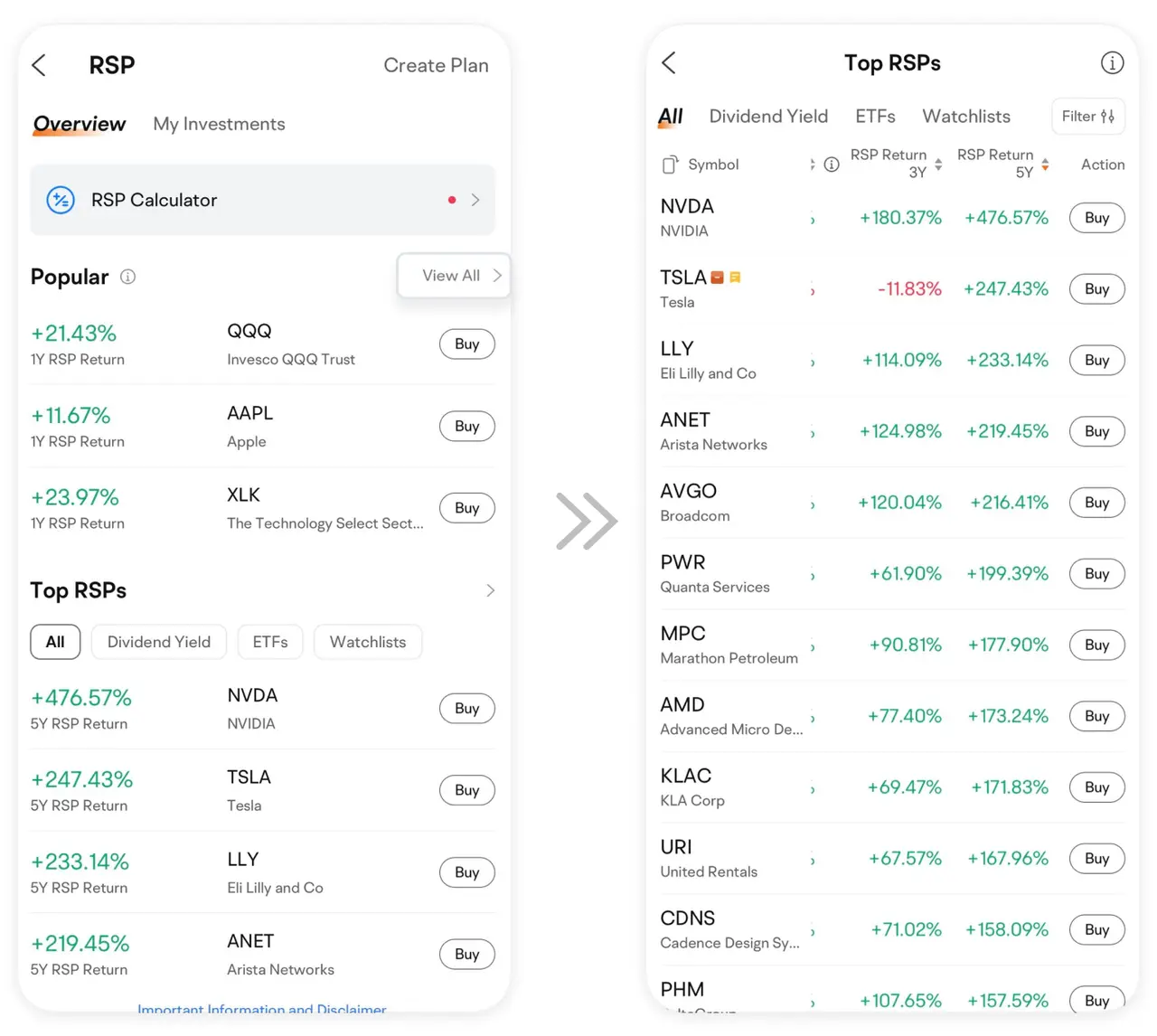 Modern trading platforms like moomoo have made RSP remarkably accessible. Navigate to the dedicated RSP section (Market > US > RSP on the moomoo app) to view curated options featuring stable blue-chip stocks and stock index ETFs suitable for dollar-cost averaging.