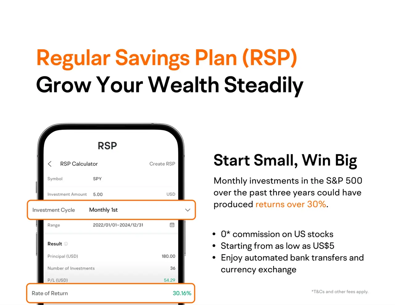 On fees: RSP doesn’t charge additional setup fees beyond standard trading costs. With moomoo, fractional US stock trades (less than 1 share) have zero commission, with only a 0.99% platform usage fee capped at RM 4.50 (USD $0.99) per order. This keeps costs minimal for small, regular investments.