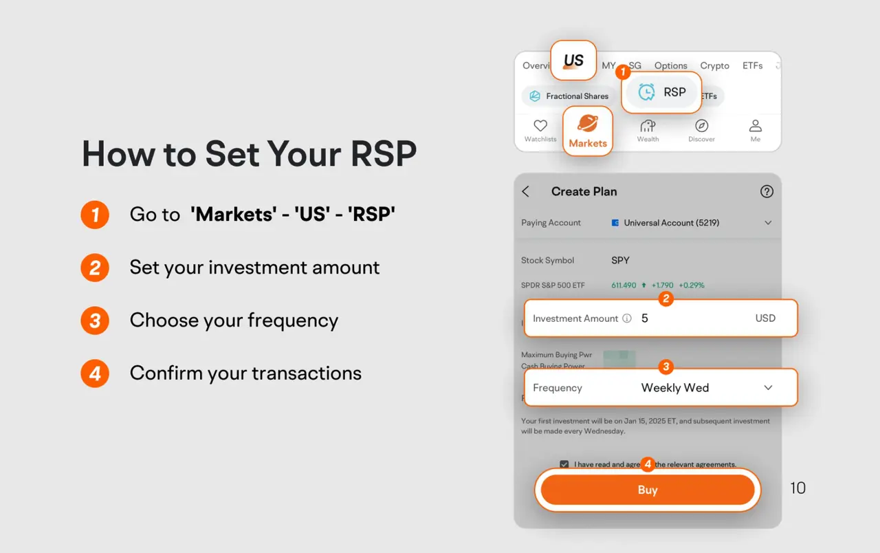 A Regular Savings Plan allows you to buy into specific stocks or Exchange Traded Funds (ETFs) with a set amount on a daily, weekly, or monthly basis. Instead of trying to ‘time the market’ by investing a large sum all at once, you build your investment gradually, making it an excellent starting point for new investors. Moomoo’s platform allows you to set up your RSP in a few steps, automating your regular investments so you can maintain consistency without manual tracking.