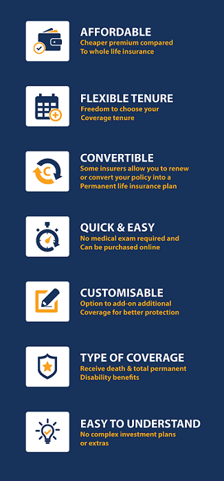 For instance, you may have invested a large portion of money into a fixed deposit account that serves to cover your family’s future expenses as a part of your financial planning. In this situation, term life insurance comes in as a secondary form of protection for you and your dependents.