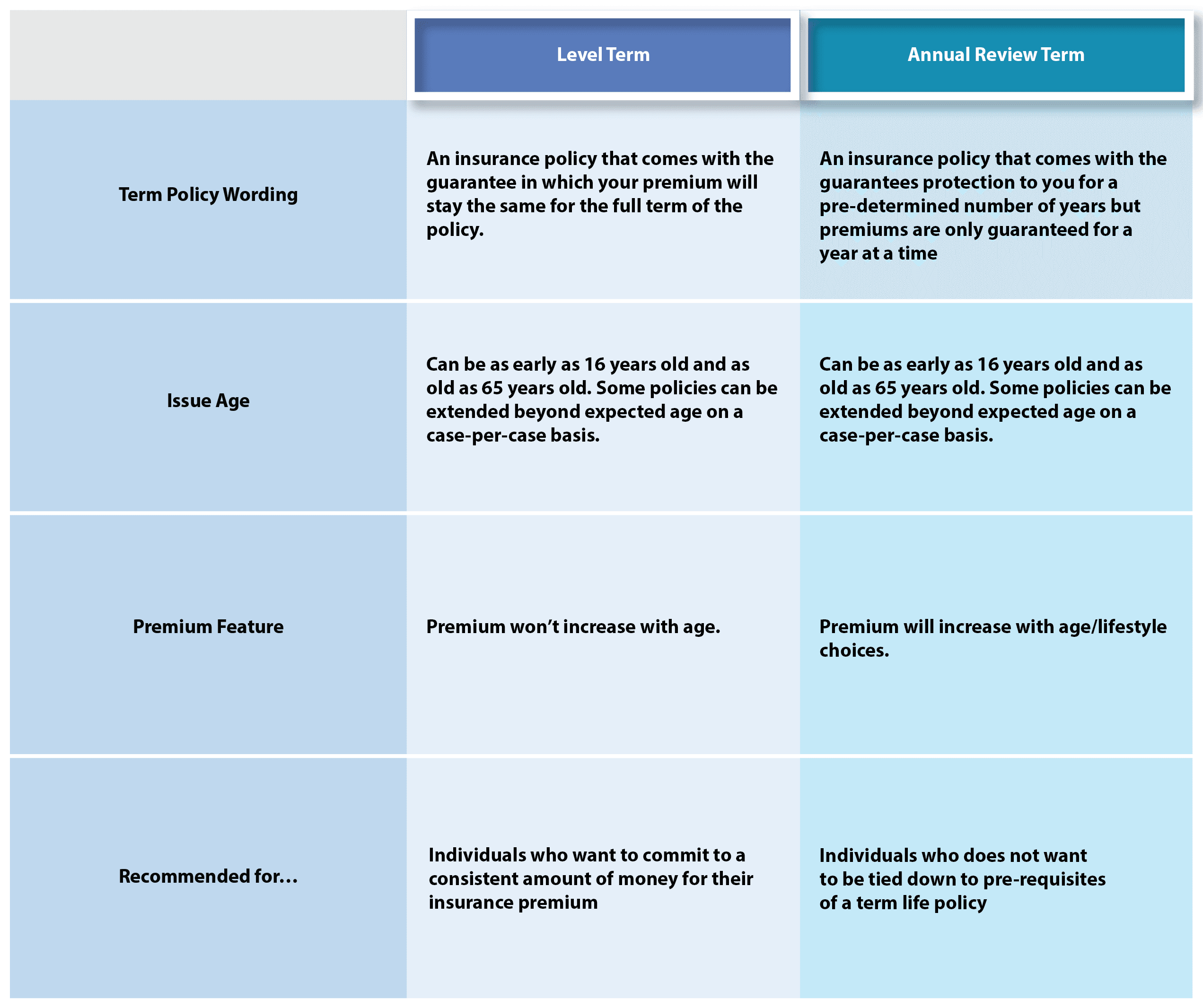 Thinking about choosing term life policy to safeguard your family needs but unsure as to whether you should opt for a ‘level term policy’ or ‘annual renewable term policy’? Well, here’s what you need to know about the types of term life insurance available. Here's a table to help you under